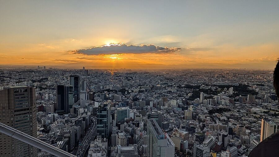 North: Yoyogi Park’s green mass, Shinjuku’s skyscraper cluster beyond, Mt Fuji on clear days visible to the west. This is the "wow" side at sunset.