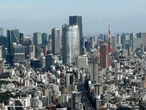 West: Yoyogi Park, Harajuku rooftops, the forest of Meiji Jingū, Shinjuku’s Cocoon Tower distinctive silhouette.